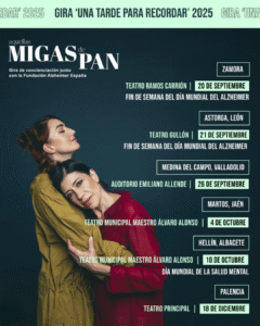 Última fecha del año:18 de diciembre – Teatro Principal (Palencia) Al finalizar la función, se celebrará un coloquio con el equipo artístico —actrices y productor— y con expertos de la Fundación Alzheimer España (FAE). Además, podrás visitar una exposición sobre la importancia del diagnóstico precoz y recibir un libro divulgativo obsequiado por la FAE. ¡Acompáñanos al teatro y suma tu apoyo a la lucha contra el Alzheimer!