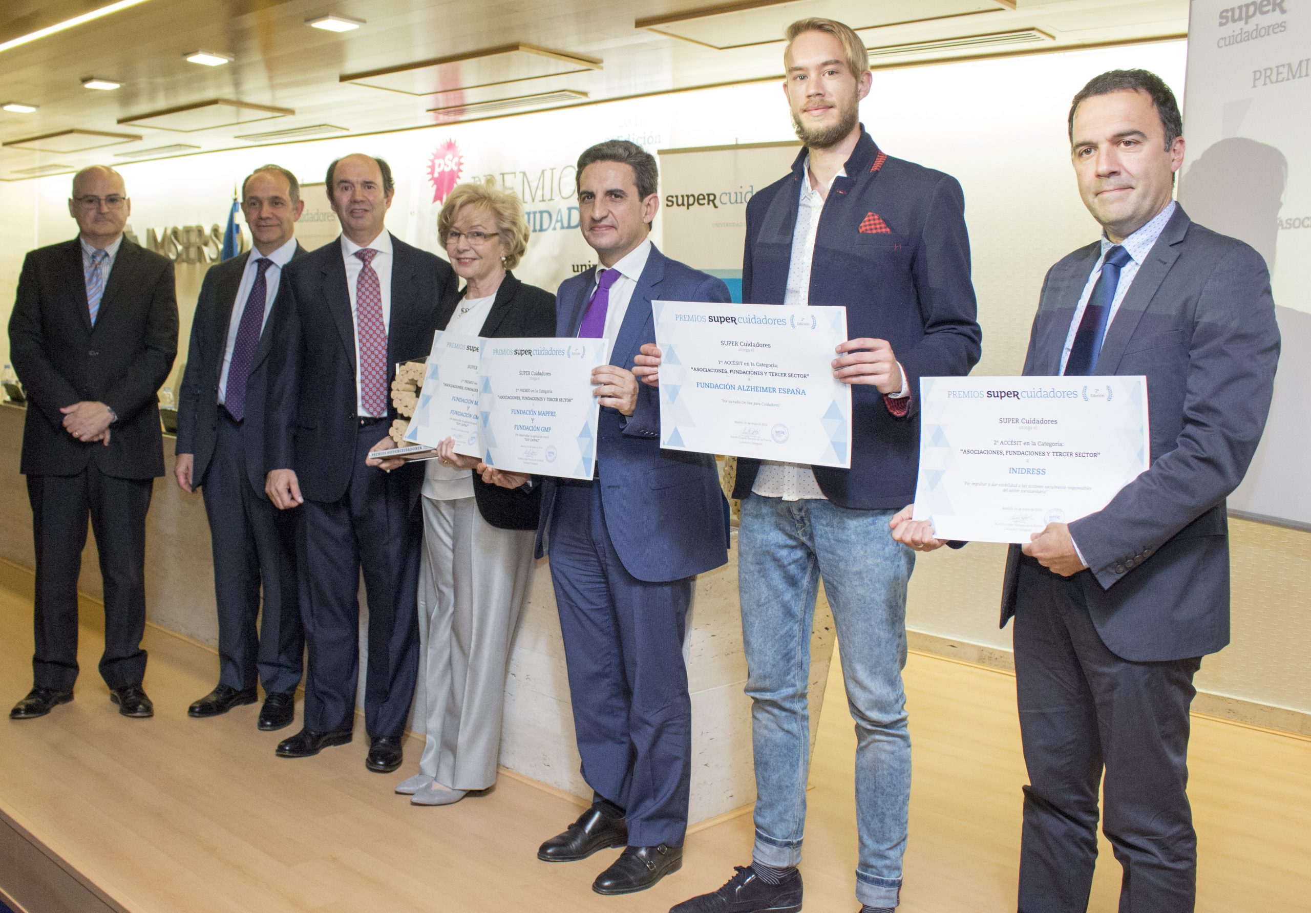 En la categoría de “Asociaciones, fundaciones, ONG y Tercer Sector” el primer premio fue para la candidatura conjunta de Fundación MAPFRE y Fundación GMP. También se reconoció la labor de la Fundación Alzheimer España e INIDRESS con el primer y el segundo accésit, respectivamente. Las tres candidaturas fueron premiadas por sus acciones y servicios tendentes a mejorar la calidad de vida de los cuidadores, personas dependientes u otros colectivos vulnerables.